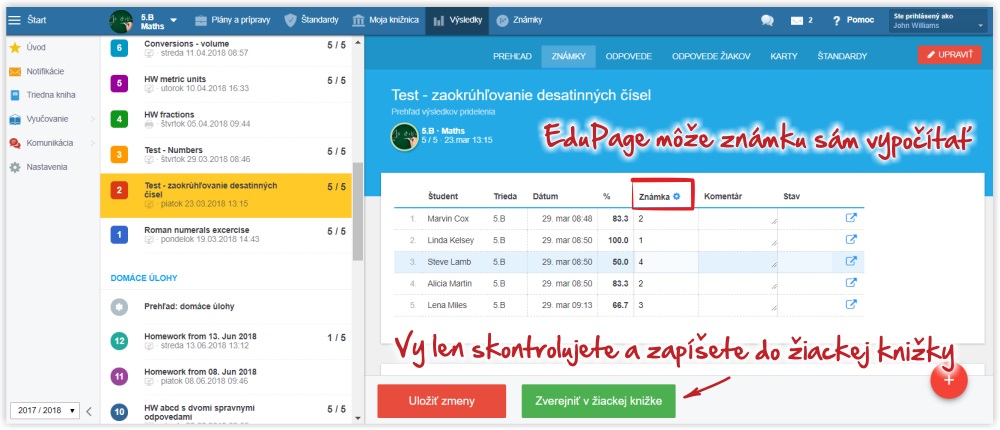Jednoducho vyberiete hodinu a zadáte žiakom známky. EduPage rodičov okamžite upozorní na novú známku notifikáciou a môžu sa s deťmi doučiť nezvládnuté učivo.