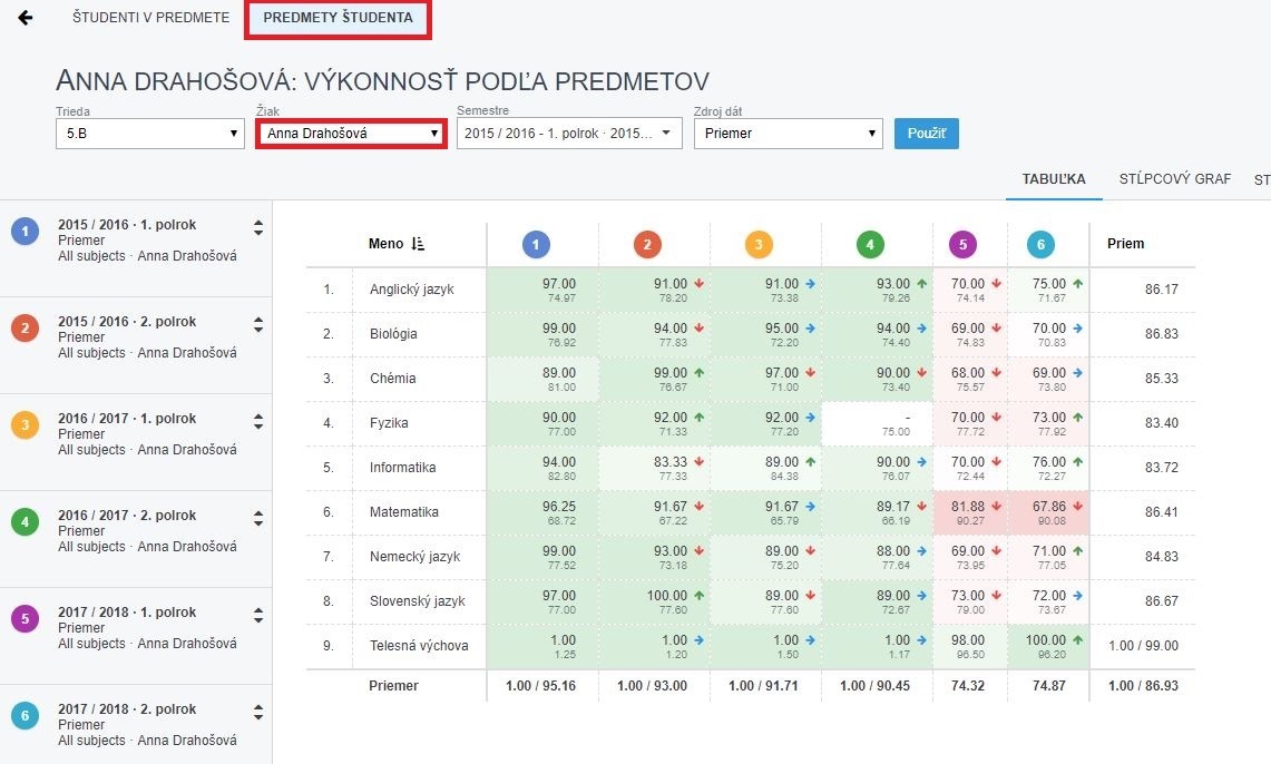 Preto je dobré pozrieť si aj druhú štatistiku – a to porovnanie výsledkov žiaka po predmetoch: