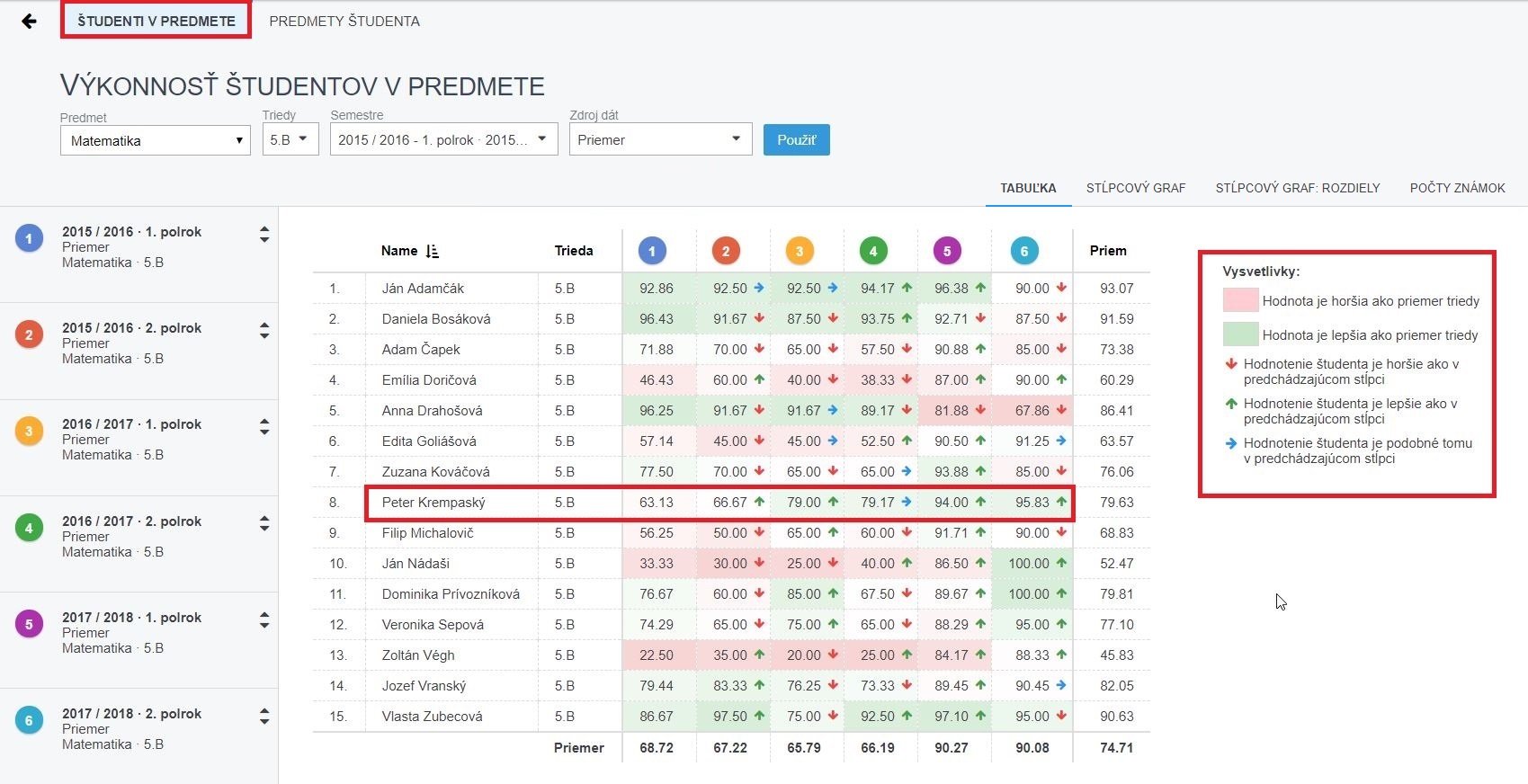 V tomto školskom roku ale získal takmer 96%, čo je výrazné zlepšenie sa oproti priemeru triedy – v tabuľke je tento fakt vyznačený zelenou farbou pozadia políčka (viď vysvetlivky). Čo to znamená? Ťažko povedať – možností je viac. Peter sa mohol zlepšiť a teraz dosahuje lepšie výsledky, ako ostatní študenti v jeho triede. Ale mohlo by to znamenať aj to, že iní žiaci v triede sa namiesto matematiky sústreďujú na iné predmety, napríklad na jazyky.
