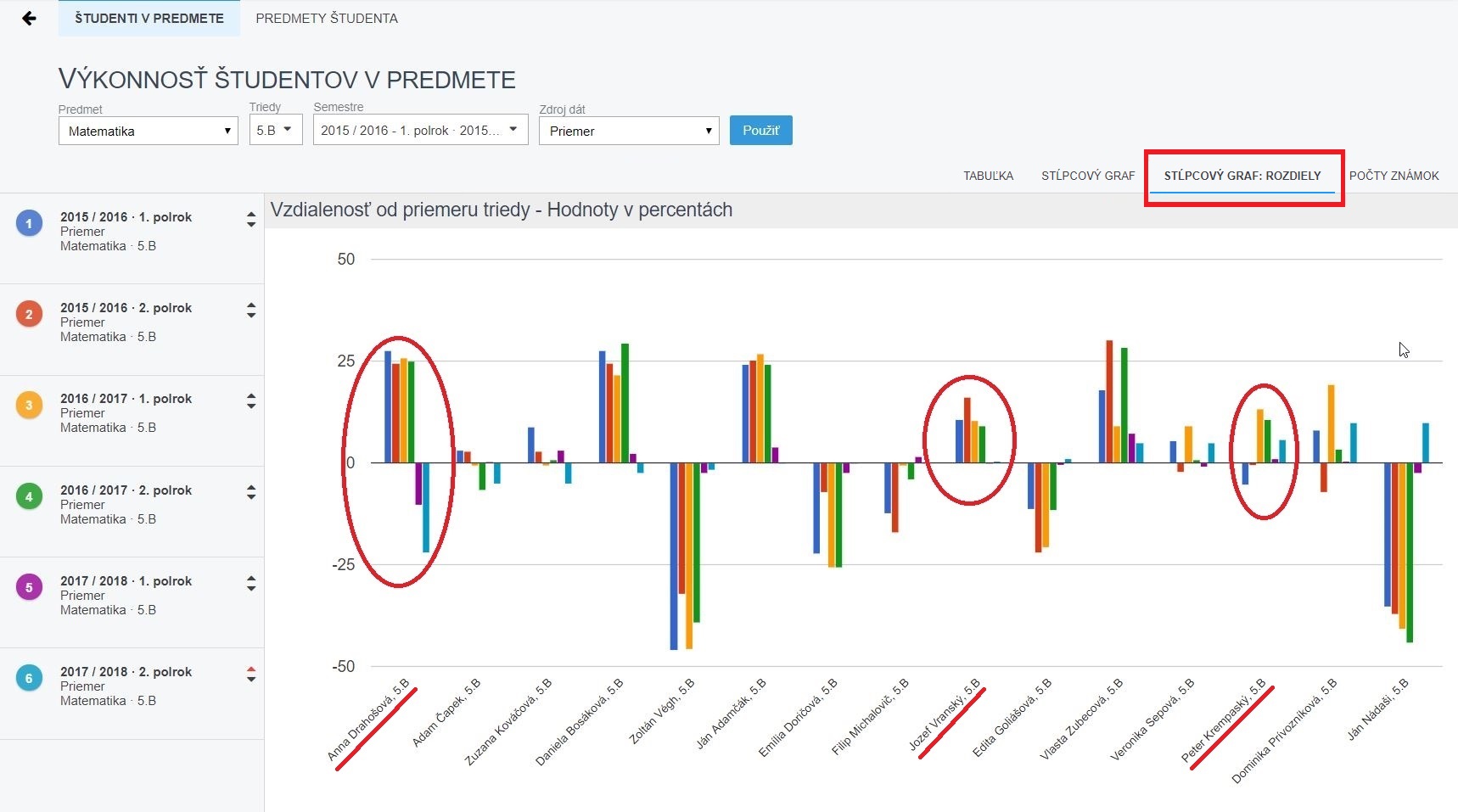Stĺpcový graf nám ukazuje iný pohľad na výsledky žiakov. Ukazuje vzdialenosť výsledkov jednotlivých žiakov za zvolené roky voči priemeru triedy (nulová os). Troch spomínaných žiakov sme zvýraznili.