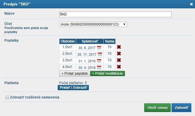 Systém samozrejme podporuje možnosť zadať rôzne modifikácie - iné výšky poplatkov pre rôzne skupiny žiakov, napr. druhý súrodenec.