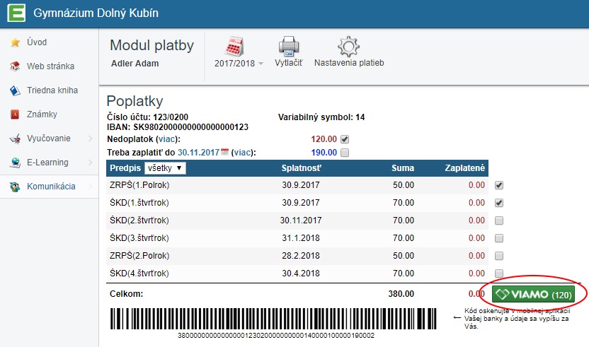 Rodič si na webe alebo v mobilnej aplikácii môže pozrieť výšku svojich poplatkov a zaplatiť zvolené poplatky pomocou Viamo mobilnej aplikácie.