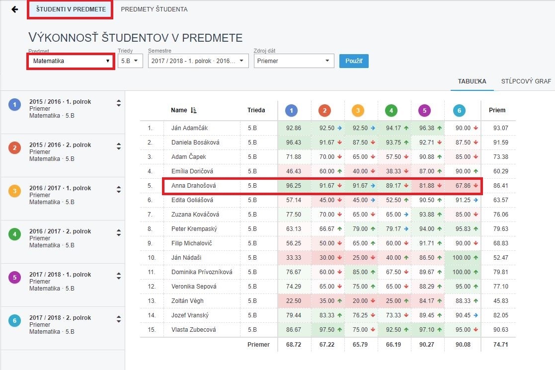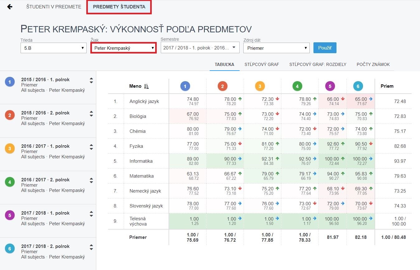 Preto je dobré pozrieť si aj druhú štatistiku – a to porovnanie výsledkov žiaka po predmetoch: