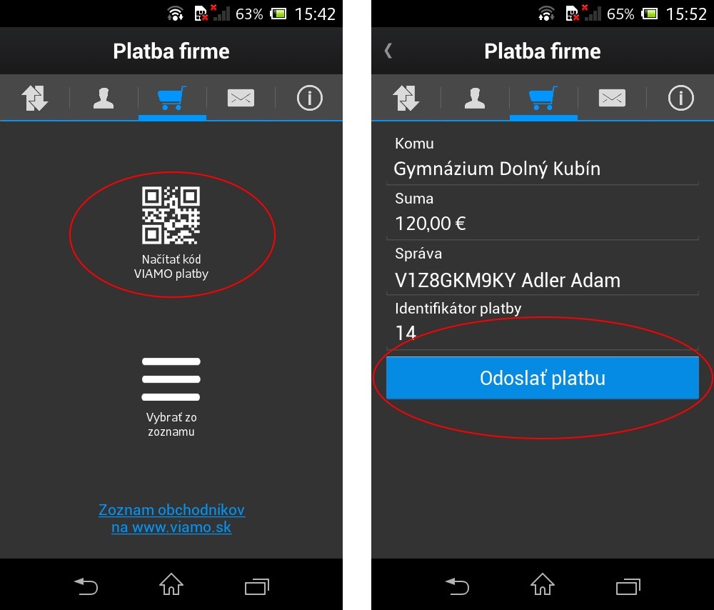 V prípade, že rodič platí z mobilného telefónu, nemusí snímať QR-kód a po stlačení Viamo tlačidla je ihneď presmerovaný do Viamo mobilnej aplikácie svojej banky, kde už len zaplatí platbu.