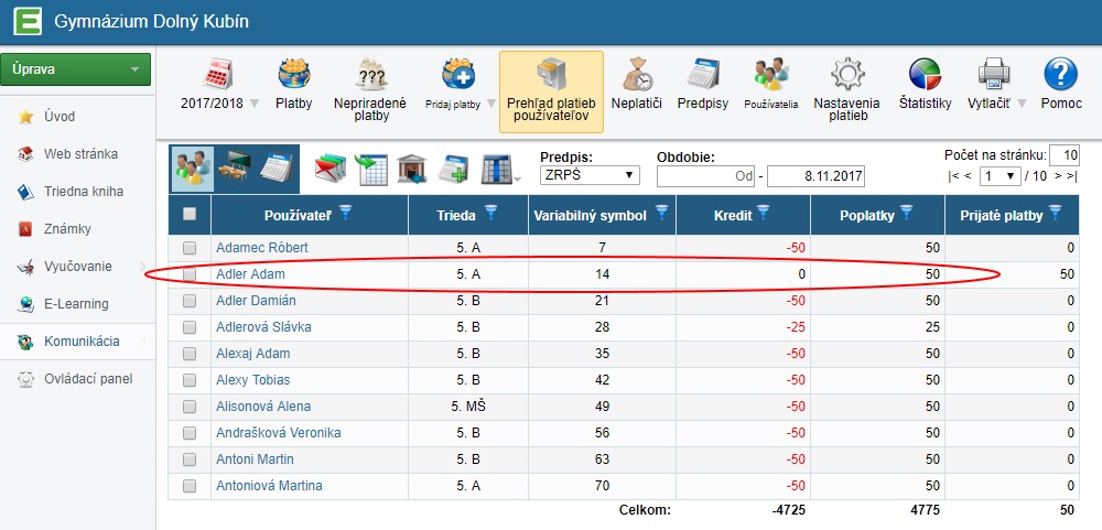 Škola má rýchly prehľad, kto ako platí - prípadne vie rýchlo a efektívne vyhľadať a kontaktovať neplatičov.
