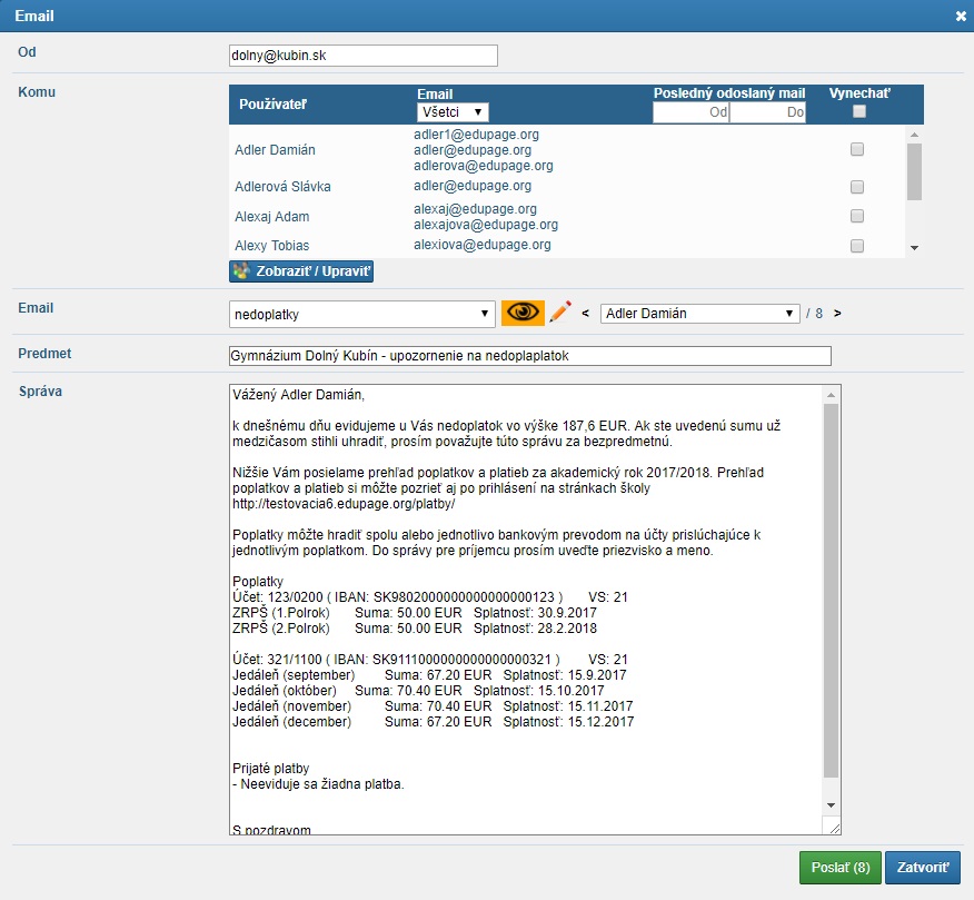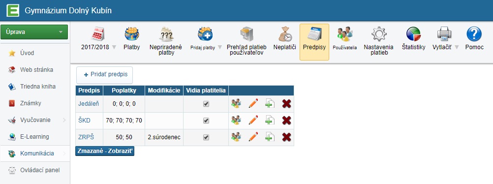 Systém samozrejme podporuje možnosť zadať rôzne modifikácie - iné výšky poplatkov pre rôzne skupiny žiakov, napr. druhý súrodenec.