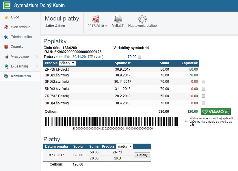 Rodič si na webe alebo v mobilnej aplikácii môže pozrieť výšku svojich poplatkov a zaplatiť zvolené poplatky pomocou Viamo mobilnej aplikácie.